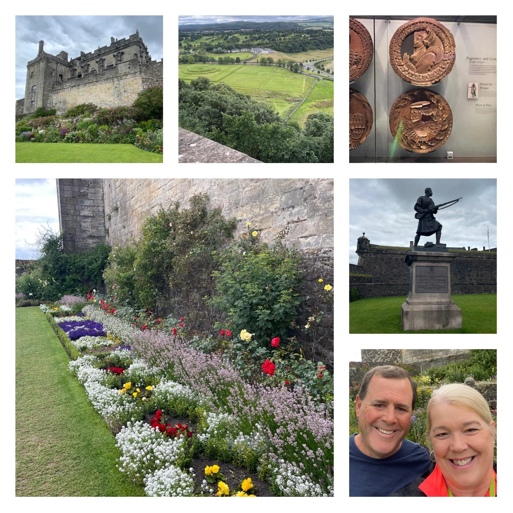July 24, 2023: Playing catch up again on the blog. We got up early to make our way to the Edinburgh Waverley train station for our trip to Stirling, Scotland. Stirling is renowned as the Gateway to the Highlands and historically it was a strategic position for Scotland. It is home to Stirling Castle. It is one of largest and most historically and architecturally important castles in Scotland. Before the union with England, Stirling Castle was also one of the most used of the many Scottish royal residences, very much a palace as well as a fortress. Several Scottish Kings and Queens have been crowned at Stirling, including Mary, Queen of Scots, in 1542. An interesting exhibit at the castle is the Stirling Heads Gallery. King James V has carved oak roundels made for the ceiling of the castle in 1540. The Stirling Heads are one of Scotland’s great art treasures. They are meter wide 16th-century oak medallions carved with images of kings, queens, nobles, Roman emperors and characters from the Bible and Classical mythology. They decorated palace ceilings until a collapse in 1777 after which they were dispersed. There have been at least eight sieges of Stirling Castle, including several during the Wars of Scottish Independence. Infamous deeds also took place here, like the murder of the earl of Douglas by James II. There is a statue of both Robert the Bruce and William Wallace at Stirling Castle.