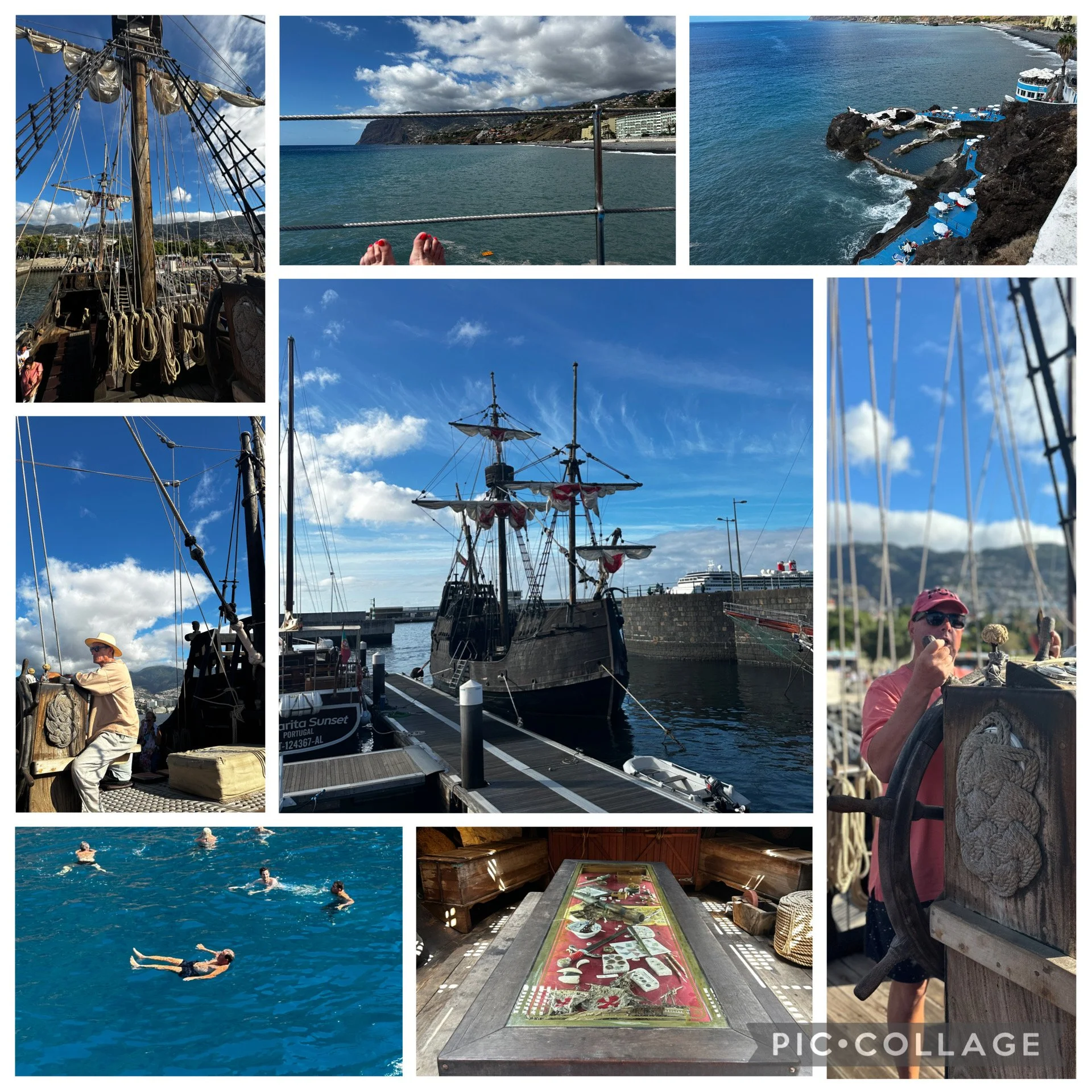 September 28, 2025: We only have a couple more days in Portugal and today we are doing a tour that was not on our original agenda. We saw the Santa de Colombo sitting in the harbor on the first day we went to Old Town in Madeira. It is a replica of the Santa Maria, used in Christoper Columbus’ first voyage in 1492. The replica was built near Madeira and was completed in July 1998. Since then, the Santa Maria de Colombo has been used for daily excursions along Madeira’s southern coast. The cruises includes stops near Cabo Girão for swimming (we have been to the top of Cabo Girão on our 4WD tour), opportunities to spot marine life (dolphins/whales), and onboard tastings of Madeira wine and honey cake (bolo de mel). We ended up getting a glorious day for being out on this ship. The seas were calm, we had a light breeze and it was sunny. It was so calming just being out on the water and cruising along the coast. We did end up seeing a pod of dolphins and I got some great video that you can see in one of my Facebook posts. When we got to Cabo Girão, you could go swimming, which Jimm took full advantage of while we were there. I am not a great swimmer, so I decided to stay on the ship. On our way back to harbor, we were treated to a taste of Madeira wine and a honey cake (known locally as bolo de mel da Madeira). Bolo De mel da Madeira dates back to the 15th century, soon after Madeira was colonized, when sugarcane was a major crop on the island. Originally baked in convents, it became a festive cake tied to Christmas and special occasions. The cake is not made with bee honey but with dark, richly flavored sugarcane molasses, which gives it its signature depth and moist texture. It is spiced generously with cinnamon, cloves, nutmeg, anise, and black pepper, and often enriched with almonds, walnuts, and candied fruits. Traditionally baked in December to mark the Feast of the Immaculate Conception, it is meant to be enjoyed throughout the holiday season, with the flavor only improving as it ages. In fact, our captain told us many make it in December and save it for the next Christmas rather than eating it right after it is made.